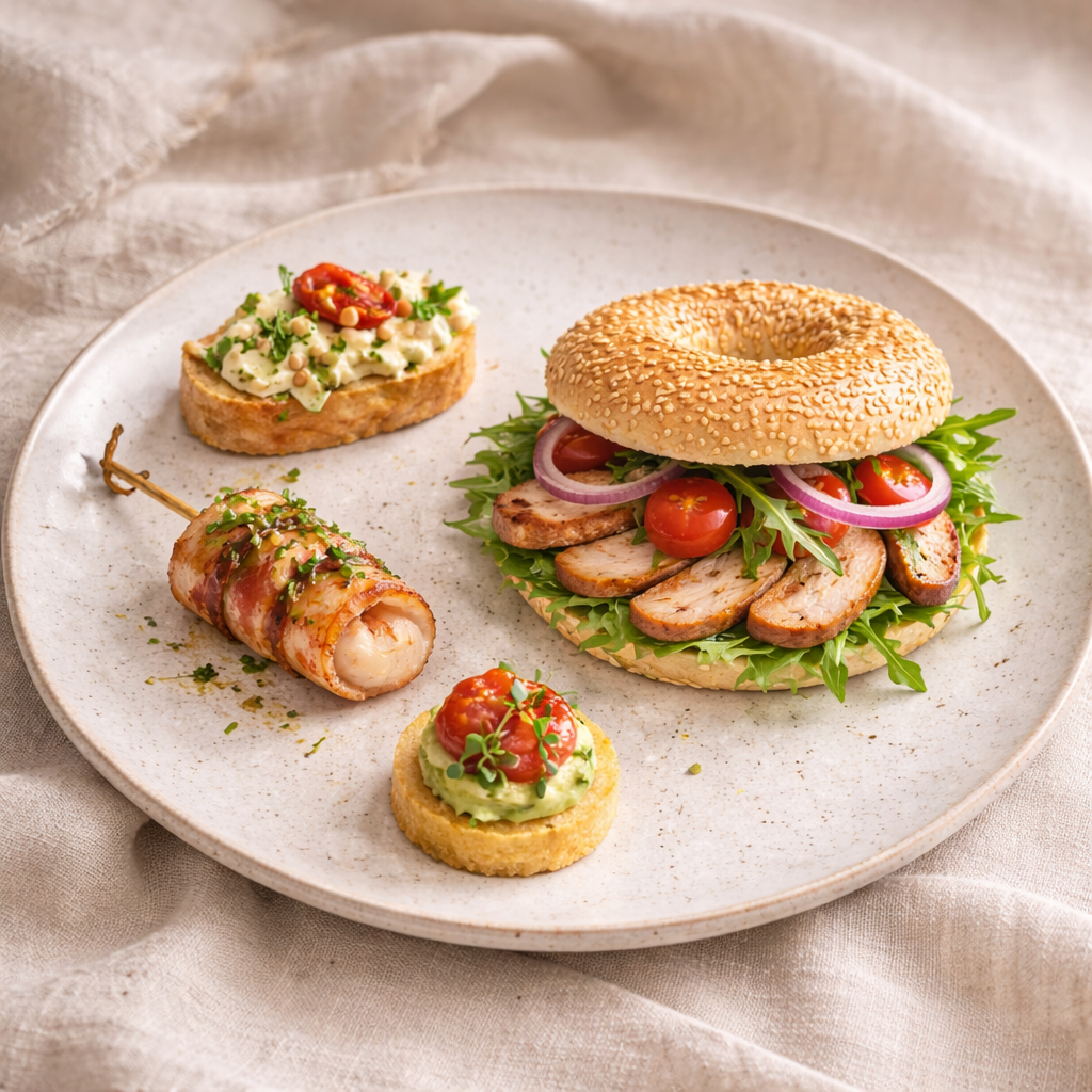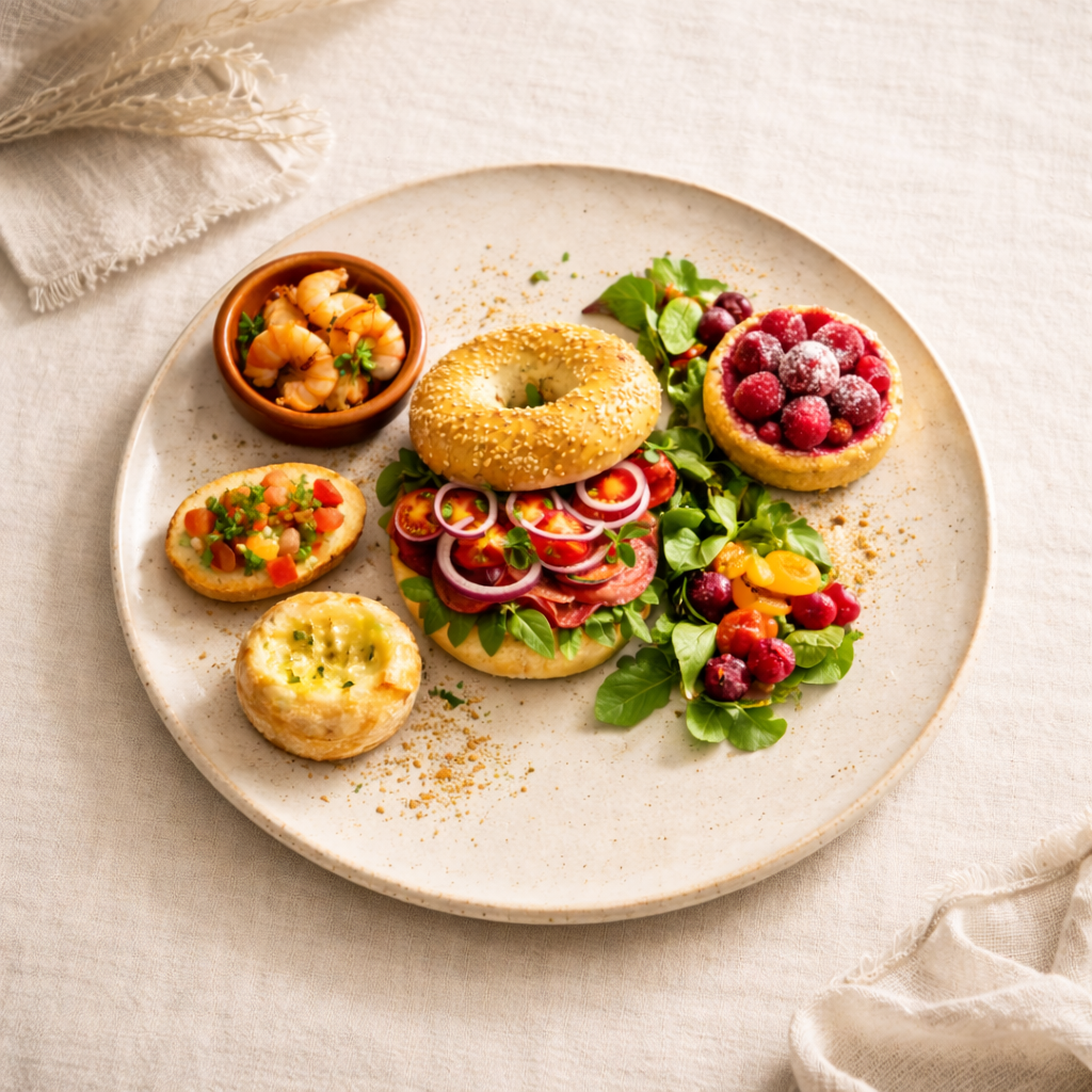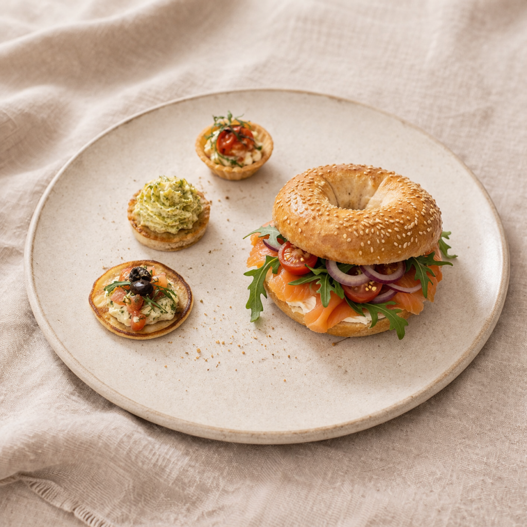 Plat : Bagel garni (poulet OU saumon fumé OU pastrami OU fromage frais & crudités), avec roquette, oignons rouges et tomate cerise