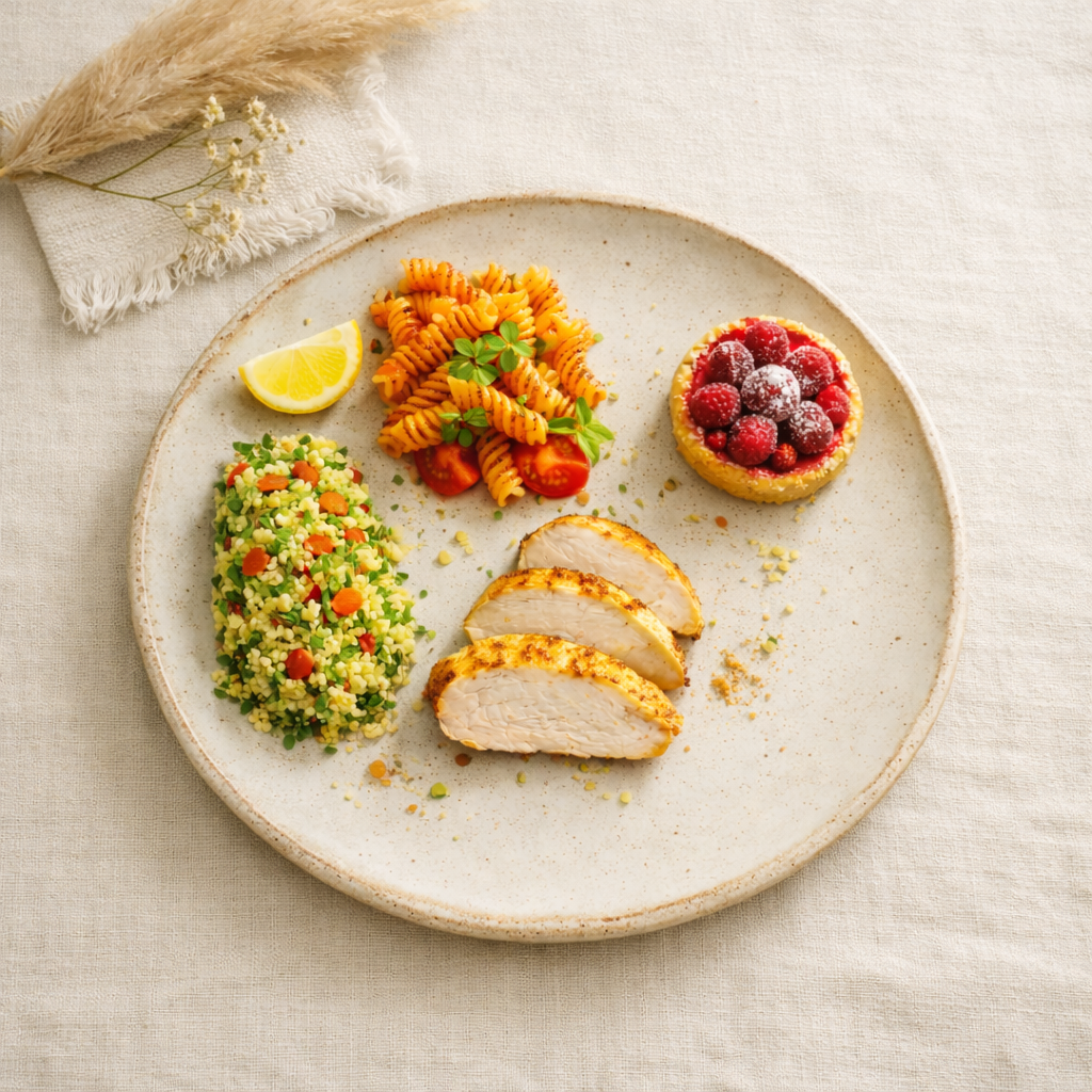 Plat : Fusilli au pesto rouge, poulet mariné à basse température.